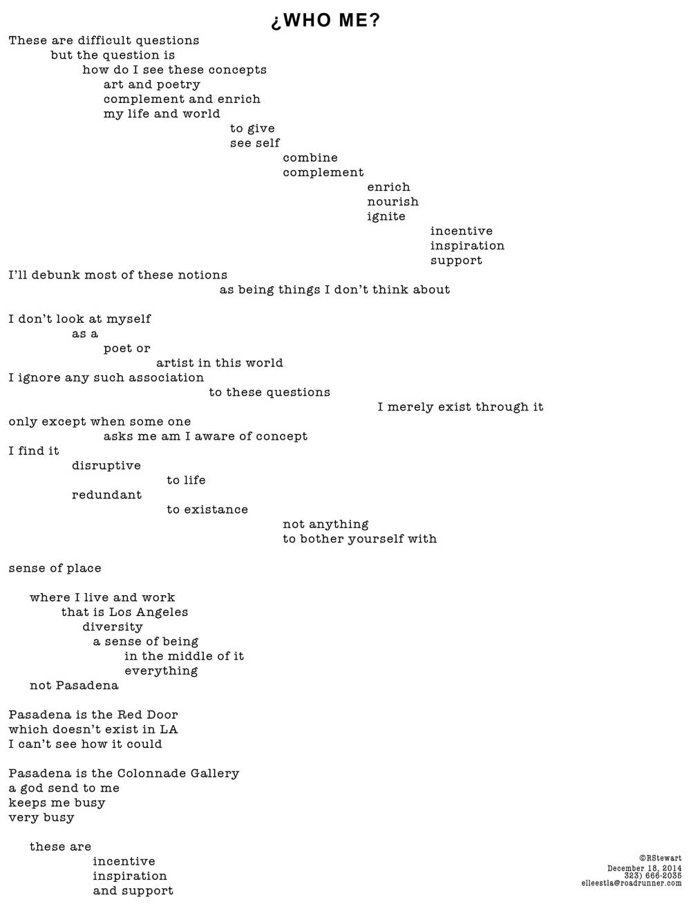 Robert Stewart is an inspiration and support to the artistic community here in Pasadena, at the Colonnade Gallery, and beyond. It is because I respect his skepticism, independent spirit, long experience with the LA arts scene, that Rick and I joined The Colonnade Art Gallery. He sees it as refreshingly different, a place for individual expression and creative community. He feels that way about our Red Door Poets at Caltech where he attends workshops each week. He approaches all his work with diligence, skill, experience and sensitivity. He is a consummate friend. When I asked him my questions I did so knowing he would be inventive, rebellious and strong. He has not disappointed me.