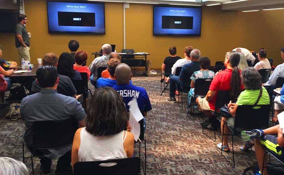 Sean McMorris, of San Gabriel, is presenting to a room of residents from the San Gabriel Valley (Photo – Melissa Michelson).
