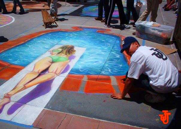 Julio Jimenez, an artist specializing in 3-dimensional chalk art, explained how he chose this year’s eye-popping chalk art statement. The inspiration for Julio’s 2-dimensional-defying gift was a billboard showing a voluptuous woman, lying on her stomach on a diving board. He recreated this image on concrete, the diving board suspended over the cool, blue water of a pool. It seemed as if you could jump in and escape the intense heat of the day.
