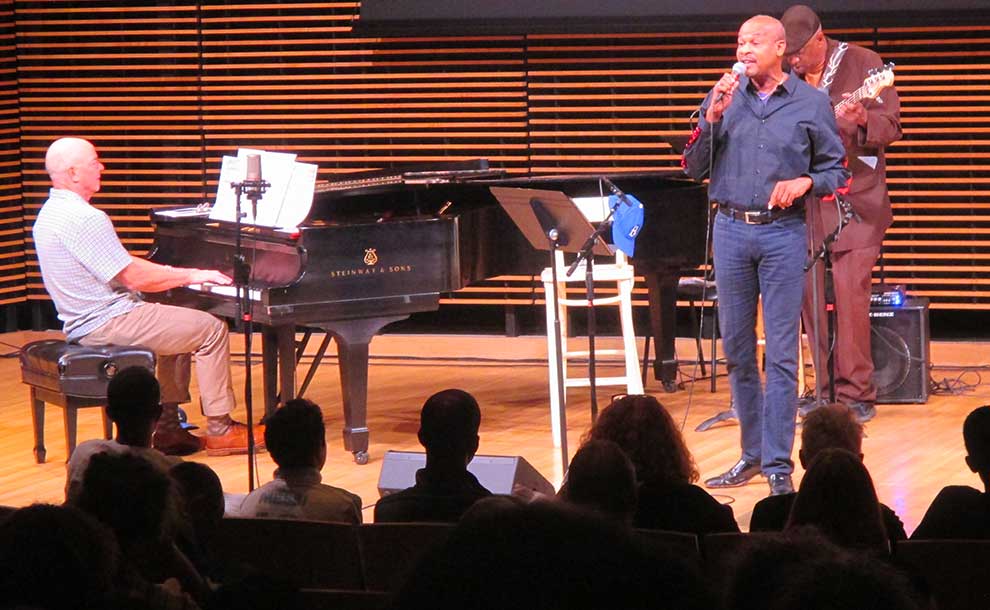 First up on the program was a collection of songs evoking the time and place of Robinson’s breaking the baseball color line. The set featuring Bryan Motley on vocals, backed by a tight three-piece band, and included a medley of tunes first made famous by Nat King Cole. Nothing could better evoke the fifties better than Cole’s “Unforgettable,” which could be applied to both Robinson and Nat King Cole. A video screen, behind the band, provided images of post-war baseball, a visual obbligato to Motley’s memories of his father, who died a couple of years ago and had been the last remaining umpire in the Negro leagues.