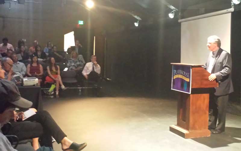 Mayor Terry Tornek speaking at the PDA annual meeting with former Mayor Bill Bogaard seen in the middle (Photo – Staff).