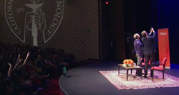 Microsoft founder and billionaire philanthropist visited Caltech on October 20 to learn about research being conducted in several labs on campus; to catch up with former Harvard classmate Caltech President Thomas Rosenbaum; and to participate in a question-and-answer session, moderated by professor of English and Dean of Undergraduate Students Kevin Gilmartin, with Caltech students at the Beckman Auditorium.