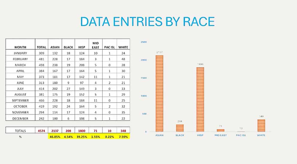 This is an analysis of the stop data for over 500 law enforcement agencies in California as mandated by AB 953. The data that was presented to the San Gabriel HEAR Commission was for the 2022 stops in San Gabriel. The 2022 RIPA report was the first year the SGPD was required to participate and the most recent data available at the time of the meeting, according to Chief Elizalde. It mirrored the state-wide data that showed that individuals perceived as Black or Latino were stopped at higher rates than those perceived to be White or Asian.