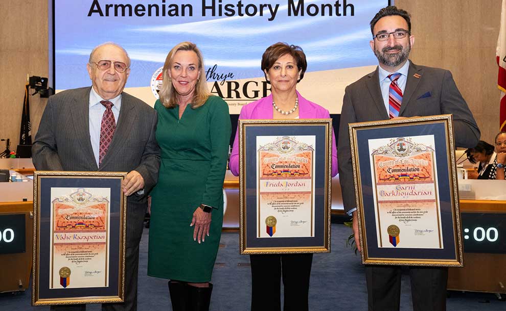 As Armenian History Month draws to a close, Los Angeles County Board of Supervisors Chair Kathryn Barger on Tuesday recognized three exceptional Armenian American leaders for their transformative contributions to medicine, innovation, and community service.