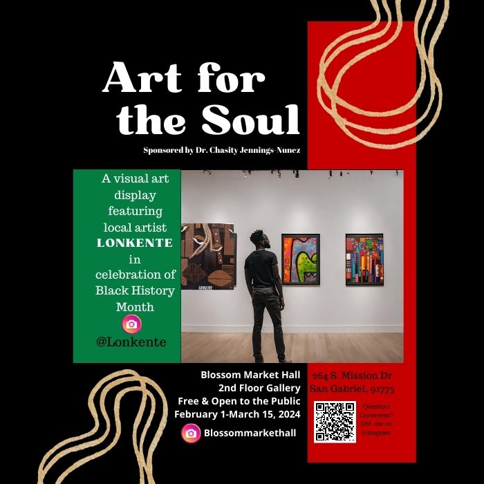 Black History Month Art Exhibit in San Gabriel February 1 - March 15, 2024 Location Blossom Market Hall - 2nd Floor Gallery 264 S Mission Dr. San Gabriel, CA 91776