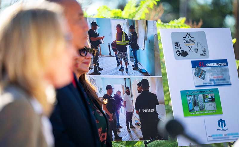 Los Angeles County Supervisor Kathryn Barger joined District Attorney Nathan Hochman on Tuesday to announce felony charges against five unlicensed contractors accused of preying on residents recovering from the Eaton Fire.