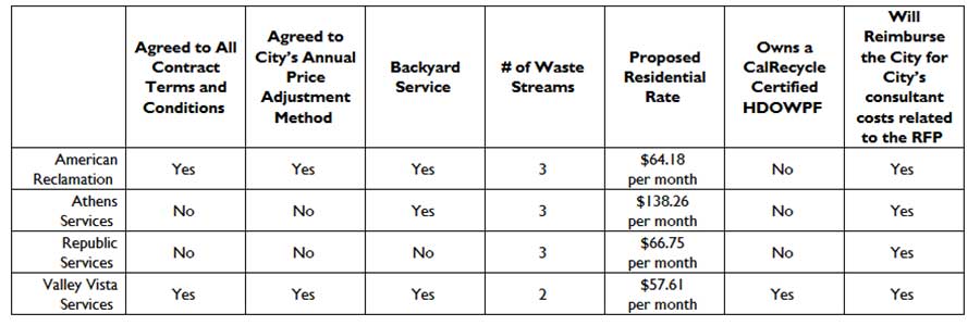 Last month, the City initiated a formal proposal process to secure waste hauling services beginning May 31, 2025. Of six companies that submitted letters of intent, four followed through with full proposals: American Reclamation, Athens Services, Republic Services, and Valley Vista Services.