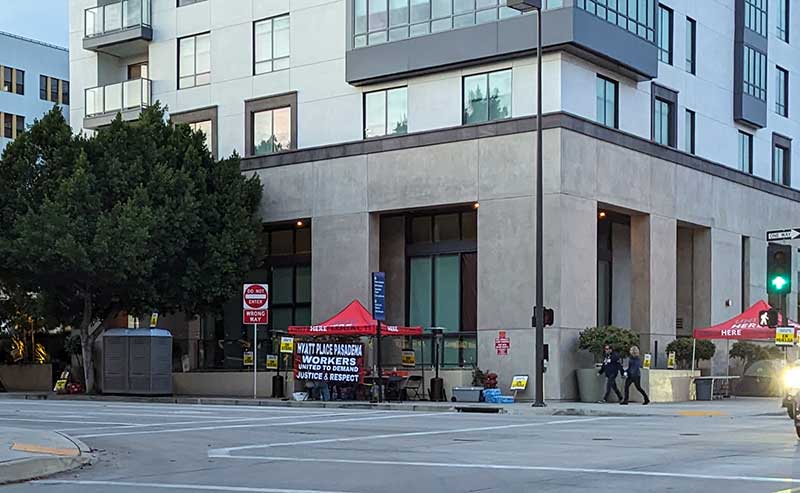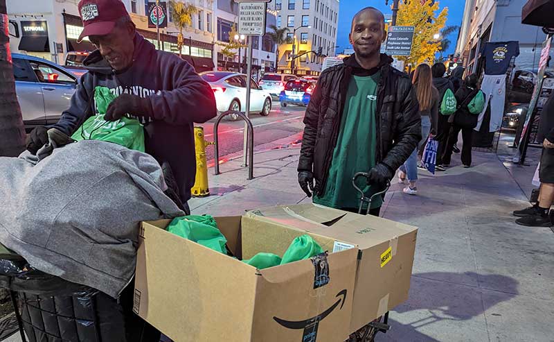 An Amazon Fresh dolly in Old Pasadena distributing bags full of candy, water, wipes and a coupon to campers! (Photo – Staff)