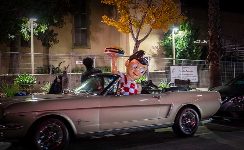 Merchandise locations are sprinkled throughout the Boulevard. Eric (last name withheld) said he will be closing shop shortly after 6:00 pm. He’ll be back at 4:00 am as he expects the sales to pick up by then. Sarah Soucey, from Sun City, has been coming to the parade for 41 years. “It’s a family tradition,” she said. Jessica and her husband (who grew up in Pasadena) have been coming to the parade for 8 years, since their first son was born.