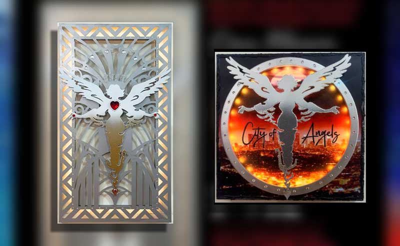 Don Bloom, who served as a designer and fabricator during the restoration of Los Angeles’s historic Wiltern Theatre, incorporates salvaged materials from the landmark into much of his work. Drawing inspiration from Los Angeles’s nickname, the City of Angels collection features hanging and freestanding artworks that blend lighting, photography, and other distinctive materials.