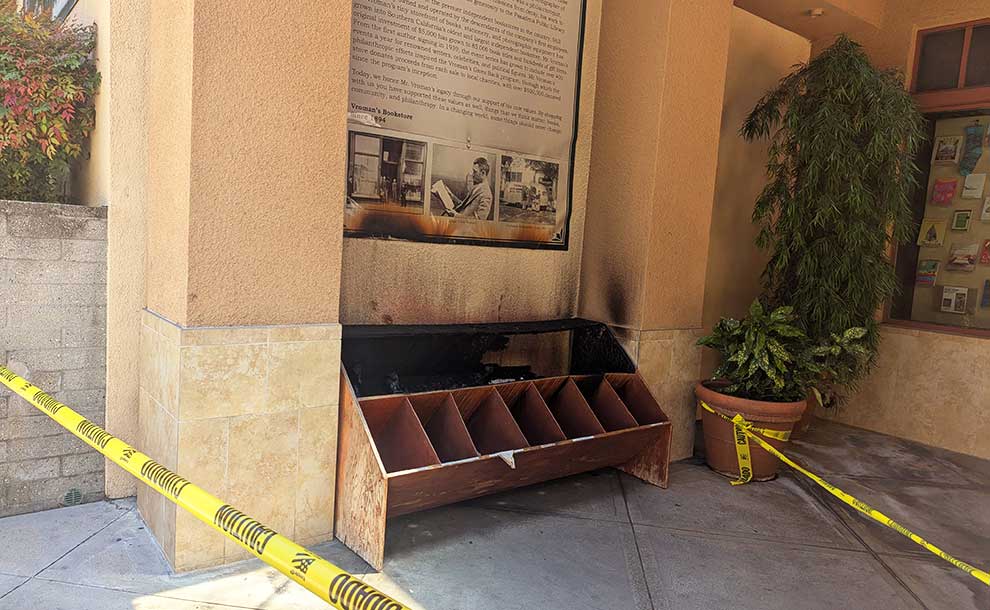A small fire broke out early Sunday morning, April 27, in the newspaper bin area near the parking lot entrance of Vroman’s Bookstore in Pasadena, leaving behind scorched wood, blackened paper, and unanswered questions.