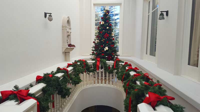 As Charles Dickens saved Christmas, and helped influence new traditions with his writings (read How Christmas Was Stolen and Found), so did American Christmas customs get largely influenced by Victorian England practices, with some local flair added in the mix as evident in the Mansion’s entry hall display where feathers were brought in from the nearby ostrich farm in South Pasadena.