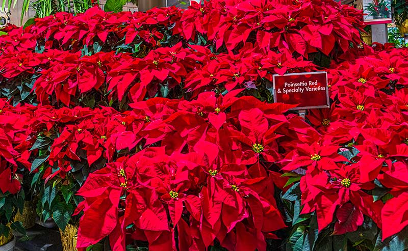 These early Poinsettias were far from the potted beauties we buy today. They were large, aggressive bushes sought mainly by wealthy hobbyists and plant enthusiasts, including Albert Ecke, who started the Ecke family’s Poinsettia business in Los Angeles’ Eagle Rock neighborhood in 1909. For years, Poinsettias were field-grown and sold either as cut flowers or as bare roots for gardeners. It took the Eckes many years of genetic modification to develop the multi-branch, short-stemmed varieties we recognize today. In the 1960s, the Eckes moved their operations indoors to boost the success of their commercial breeding and launched a highly successful marketing campaign, positioning the potted Poinsettia as “the Christmas plant.”