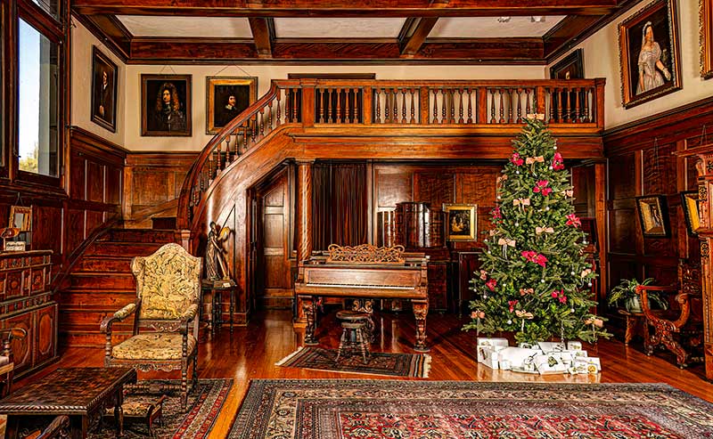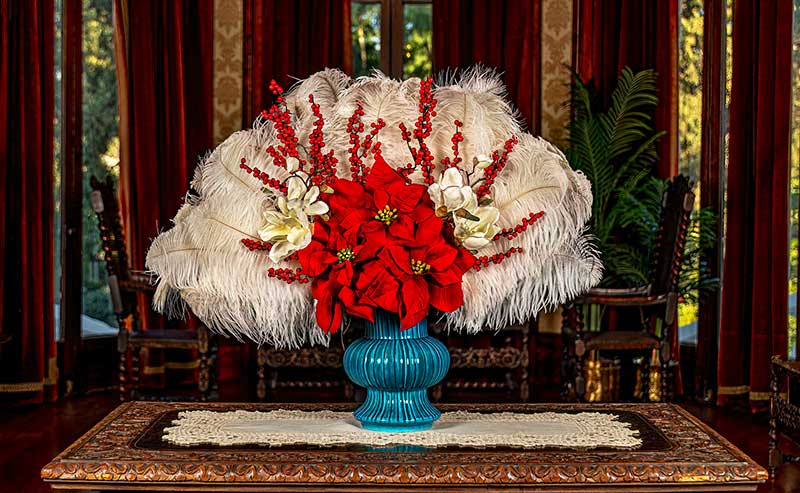 *Poinsettias enhance the Edwardian-style holiday décor inside the Fényes Mansion at the Pasadena Museum of History. Only individual blooms and stems are used, as the potted plants had not yet been developed. (Note: Only artificial plants and fruit/nuts are used in the Mansion to minimize risks of spills, breaks, stains, and insect damage. However, “permanent botanicals” are also period-appropriate, as their popularity peaked during the Victorian era.)