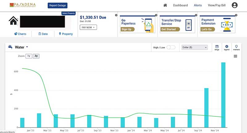 In any event, we discovered that we had a substantial leak in the water main, and this was recognizable by the graph of water usage via the Pasadena Water and Power account page.