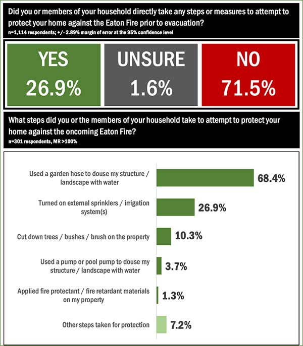 - 27% indicated that their household tried to protect their property; 1% hired private firefighters; 40% in two areas (Farnsworth and Millar) led do‑it‑yourself property protection efforts.