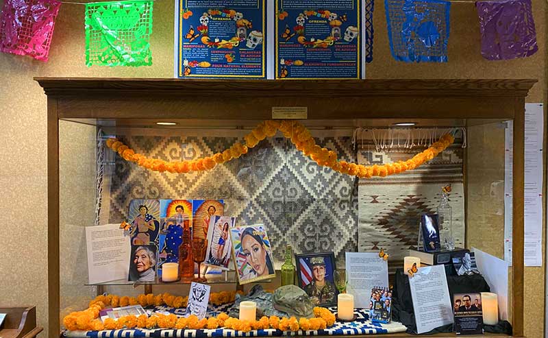 Día de los Muertos (Day of the Dead), a celebration of both life and death that originated in Mexico is traditionally celebrated November 1 & 2. Altars built for this celebration allow us to briefly reunite with the dead and to provide ofrendas or offerings to celebrate their lives. These ofrendas entice their souls to visit us on earth to hear the prayers and smell the food and enjoy the celebrations. The dead might be represented by photos or other facsimiles that reflect their physical likeness of their time on earth. The offerings can be favorite foods, or drinks, or flowers, or sentiments of appreciation. Throughout the altars you will see skulls or calaveras that are painted with upward facing smiles to laugh at death. You will also see marigolds that will help guide the dead souls to the ofrendas.