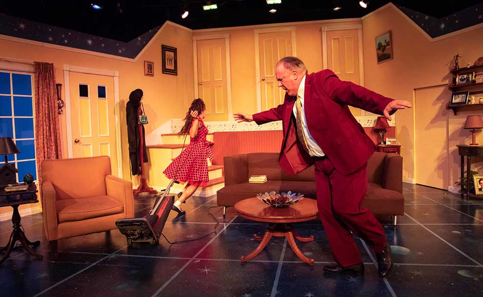This play takes quirky, offbeat, surreal, and absurdist to the max. At least 5 times I turned to my friend and made a willy grinning “whaaatttt????” face, it was so much fun. Don’t look for a straightforward plot with a resolution, or logic, or characters within the usual parameters of humanity and decency (after all, the “half-sibling” in the family was created with an alien contribution and the relationship between father and daughter is iffy). The set is pure 50’s, space age (in more ways than one), and you will never be ready for what happens next. Perfect for audiences ready to roll with the punches, accept the unacceptable, enjoy the kitschy set and suspend the usual parameters of a plot. Jack and Jill (yes, you heard that right) (played by Phillip William Brock and Alina Phelan) are the quintessential 50’s nuclear family, with a bullied teenage son, Eddy (John Patrick Daly) who’s physicality compensates for his teenage angst, and a soul-searching daughter, Tammy (Caroline Klidonas). They have the ideal family, 2-1/2 children, with daughter Terry (Cat Davis) serving as child number 2.5, since she is half human and half, well, something extraterrestrial because that was the only option. Their daily challenges were never represented on Ozzie and Harriet, Father Knows Best, Leave It to Beaver, or the Donna Reed Show.