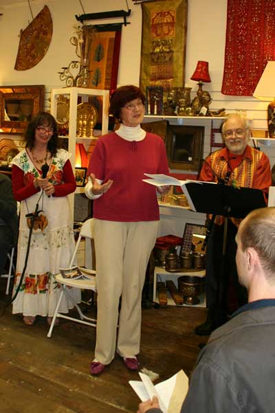 Mira N. Mataric at the “Poets on Site” held at Ten Thousand Villages on Lake Ave in Pasadena. She was accompanied by Rick Wilson on the flute (R) and MC Kathabela (L).