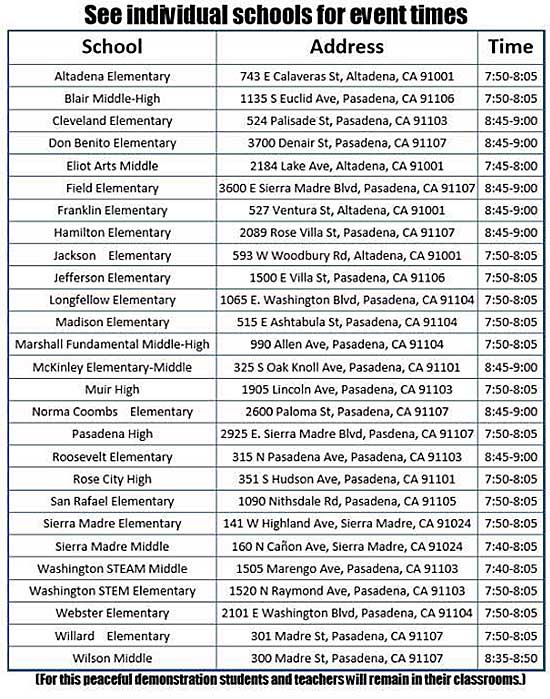 Demonstrations are happening on this day throughout the PUSD community in Pasadena, Altadena, and Sierra Madre, and the PTA units are requesting as many community members as possible show up at their local school to participate in the event. Blair High School will have a special role as it will host a number of elected and community leaders who will briefly speak to the issues surrounding campus violence. The following are scheduled to attend: