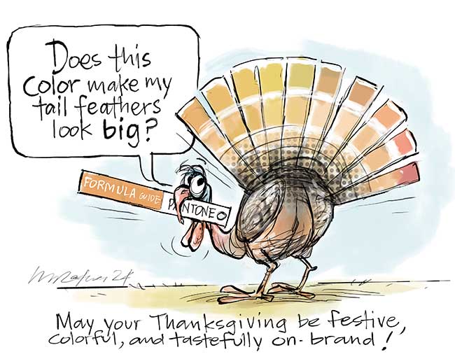 a turkey checking his feathers colorsNote to Self cartoon: “Thanksgiving on Brand”