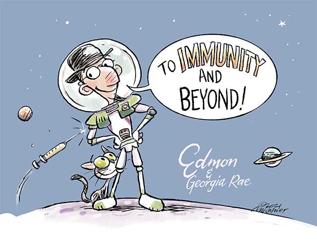 space man saying: to immunity and beyondNote to Self cartoon: “To Immunity”