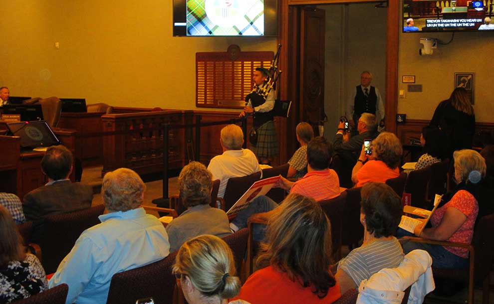 A member of prize winning Pasadena Scottish Pipes and Drums Corp at Opening of Session (Photo – Garrett Rowlan).