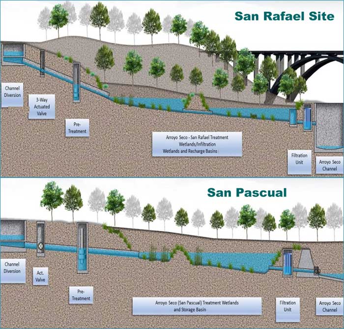 Downstream, at the San Pascual Site, water flows—including those from San Rafael—will be diverted again for further treatment and infiltration. A portion of this cleaned water will be reused for non-potable purposes, such as irrigating the Arroyo Seco Golf Course, helping to reduce reliance on potable supplies.