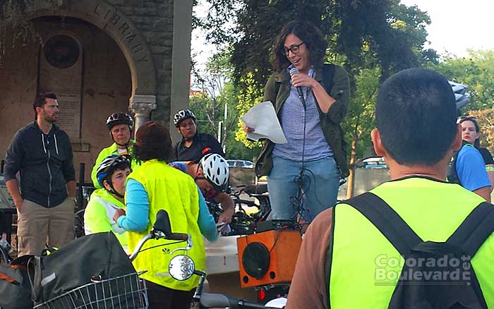 Julia Lippe-Klein, Program and Marketing Manager at C.I.C.L.E., addressing the crowd on the 1st day of Pasadena Bike Week 2015.