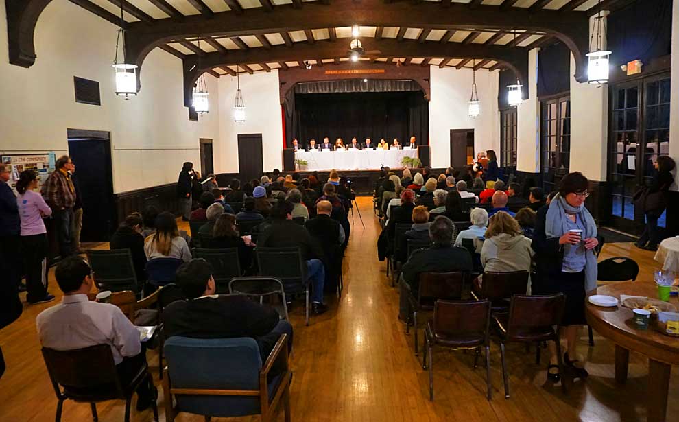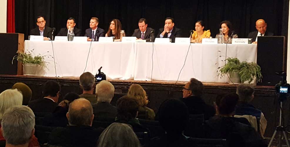Throop hall was full with a standing room only audience. Six questions were asked of each of the nine candidates during the 90 minute forum, in addition to their opening and closing statements. For those of you who don’t have the time or patience to sit through a 90 minute video that is available of this event, which gives the candidates complete, word by word responses to the questions, this article is just a peek into their responses.