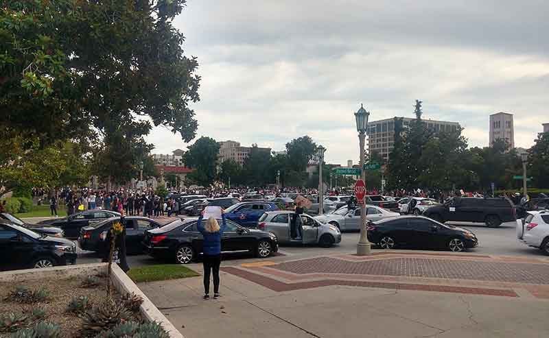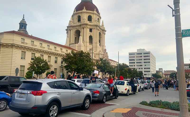 We reached the turn at Garfield and Walnut into Pasadena City Hall and Centennial Square around 5:20 pm. By now it was clear that many would not even make the last leg of the caravan route. Pasadena Police started instructing cars to circle around, where many found parking on adjacent streets. The mood was festive at Centennial Square. A live band filled the atmosphere with reggae music. Cars quickly filled up the entire square. A large gathering with proper social distancing already greeted us on both sides of the square. By that time, we were uploading our videos on the newspaper’s Instagram. A comment left by Armory Center of the Arts described the feeling of the moment: “History gets made by those who show up.” As politicians started speaking to the crowd, people of all ethnic backgrounds were feeling the solidarity of one voice. Some of the Politicians were milequetoast, for the exception of Tyron Hampton. One white woman yelled from behind: “Mayor Hampton 2024.” One person holding a “No Justice, No Peace” sign on the steps of City Hall behind one of the politicians shouted: “Oh yeah, how you gonna do that?”