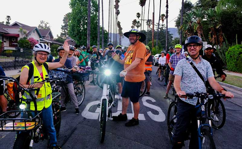 For each of the past few years, Pasadena Complete Streets Coalition has hosted a series of Summer Night Rides. These easy-paced, social rides bring together a diverse group of people from Pasadena and the surrounding area. We decorate our bikes with lights and usually carry a speaker playing music to create a welcoming atmosphere. The groups include young children, seniors, and even a few dogs. The rides are very popular and are attended by 70-90 bike riders. These large groups create a safe space on the street, and drivers usually give us plenty of room. Sometimes, the ride looks a little bit like a parade, and kids will wave and cheer when the ride goes by.