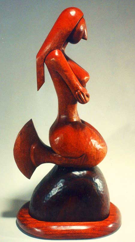 Peter Larsen, Tujunga, California: Contemplative Mermaid, September 1996. Honduran mahogany on walnut, 17¼ inches tall. The tide came in and she disappeared. [Work time: 18¼ hours.]