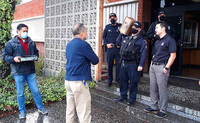 (L-R) Councilmembers Jason Pu and Tony Ding presenting masks and hand sanitizers to San Gabriel Police Department (Photo – Cheryl Cabot)