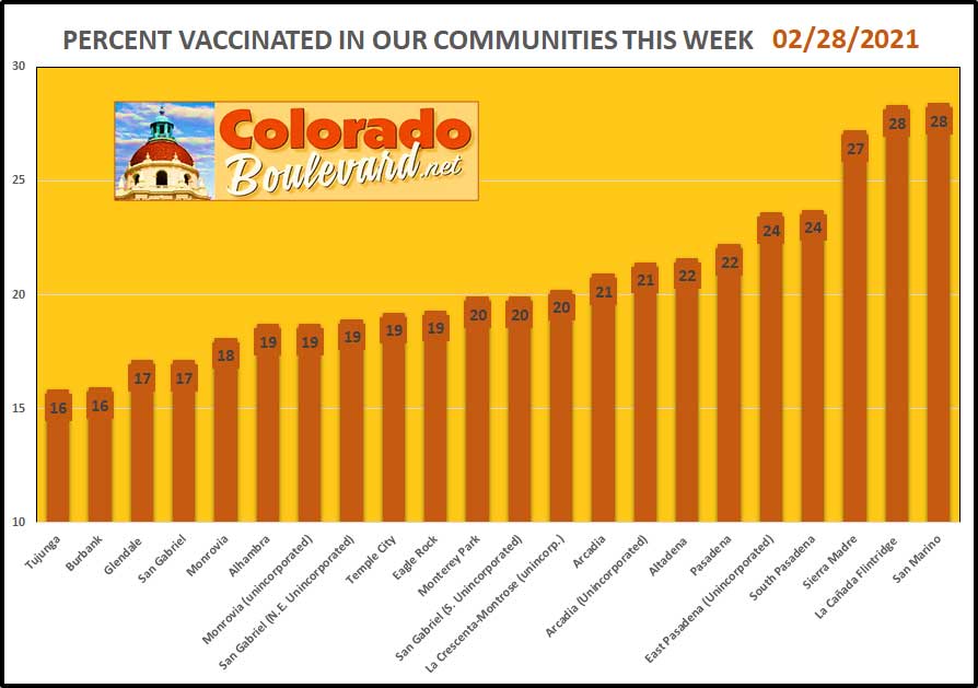 Overall vaccination Rates for Pasadena, San Marino, La Canada Flintridge, Altadena, Sierra Madre reported on the Los Angeles County Public Health Dashboard (as of February 28, 2021).