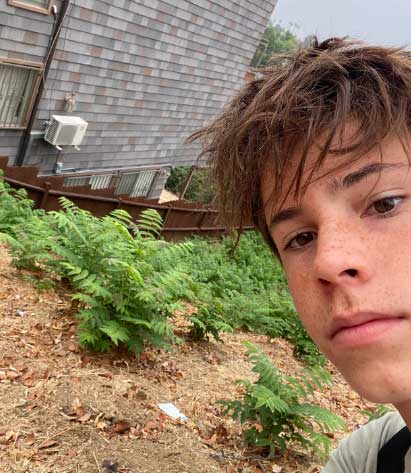 SPHS student Mateo Salas identifies the invasive Tree of Heaven plant in a South Pasadena yard. (Photo – Ryan Long)