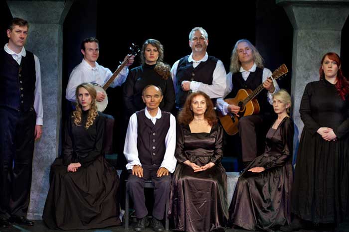 The ten actors in this presentation each played several roles, and the transitions were smooth and convincing. The details of their lives, from mundane to romantic to mysterious to sordid to perhaps criminal, were presented by the spirits themselves, each coming forth from the beyond to give us a glimpse of the life they lived before being eternally planted on the hill. Some of the characters are solitary, some have intertwining stories, and all are loosely woven together with snippets of Americana music. The format of the presentation was lively and fun, but with its somber moments as well, and kept the audience looking forward to the next voyeuristic glimpse into someone’s life lived long ago. The theater is very small and cozy, with just forty seats, making it feel that the audience might be at a party with the spirits, eavesdropping on all the conversations in the room.