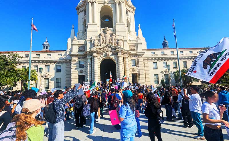 Alonso from John Muir High School said the protest was about ongoing injustice in the city. “We are here to protest the injustice that keeps on happening every day in our city, like ICE taking away innocent workers that came here just for a better life,” he said.