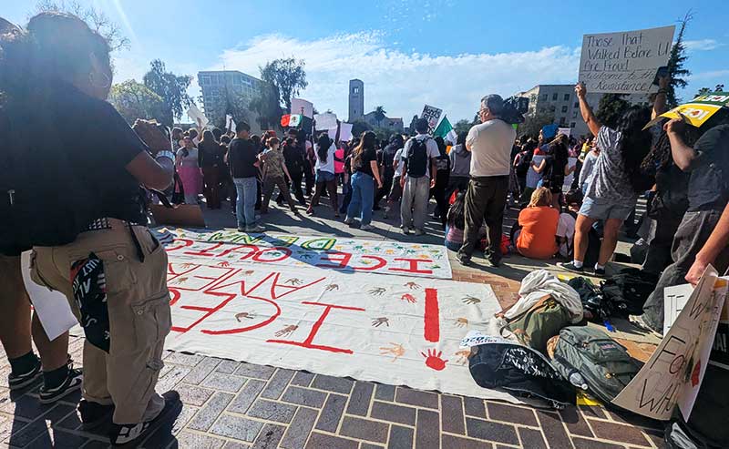 Madison, a senior at John Muir High School, said she was protesting for those who cannot. “I’m here to protest for the people that cannot protest and for the rights that we need for our community and our world,” she said. “Because having ICE here is not okay. And being an immigrant is okay. Being an immigrant— [like] my family is.”