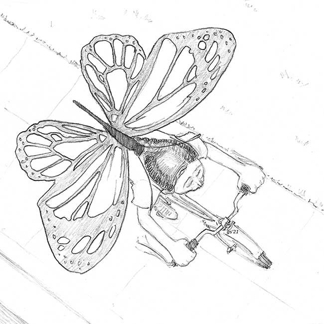 a butterfly over the head of a girl on a bicycleThoughts for Pennies cartoon: “Above It All”