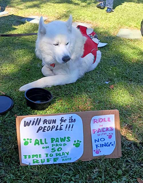 Furry children attended Alhambra’s No Kings rally in support of their parents (Photo – Adele Andrade-Stadler)