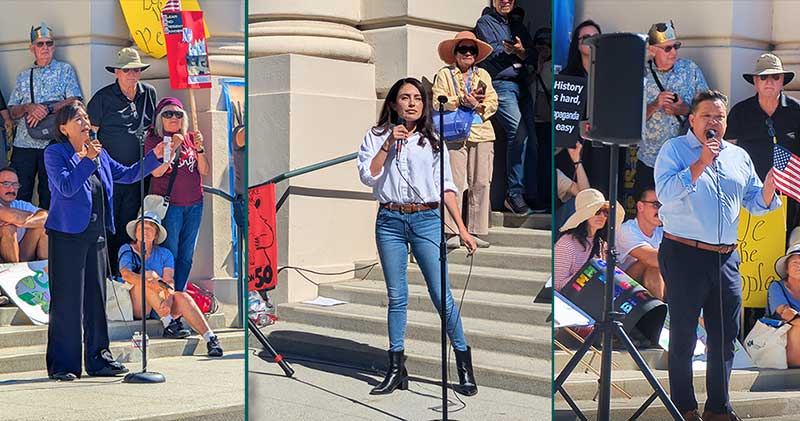 In Alhambra, an estimated 500 demonstrators assembled at Alhambra Park, while nearby Sierra Madre saw its largest-ever public gathering, with about 1,000 people filling Kersting Court and surrounding sidewalks. Both Rep. Judy Chu and State Sen. Sasha Renée Pérez addressed attendees before heading to Pasadena City Hall, where more than 3,000 people converged in Centennial Square and along Colorado Boulevard. They joined Pasadena Mayor, Victor Gordo, in greeting the crowd and underscoring the event’s civic purpose