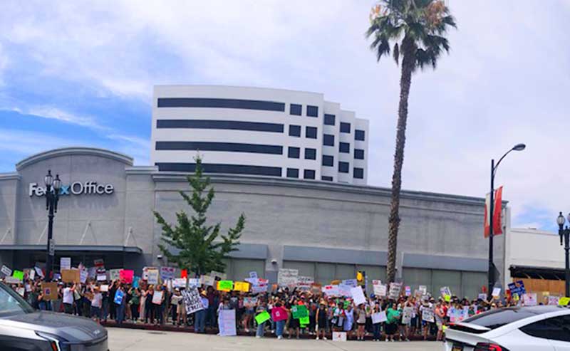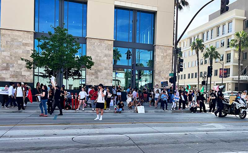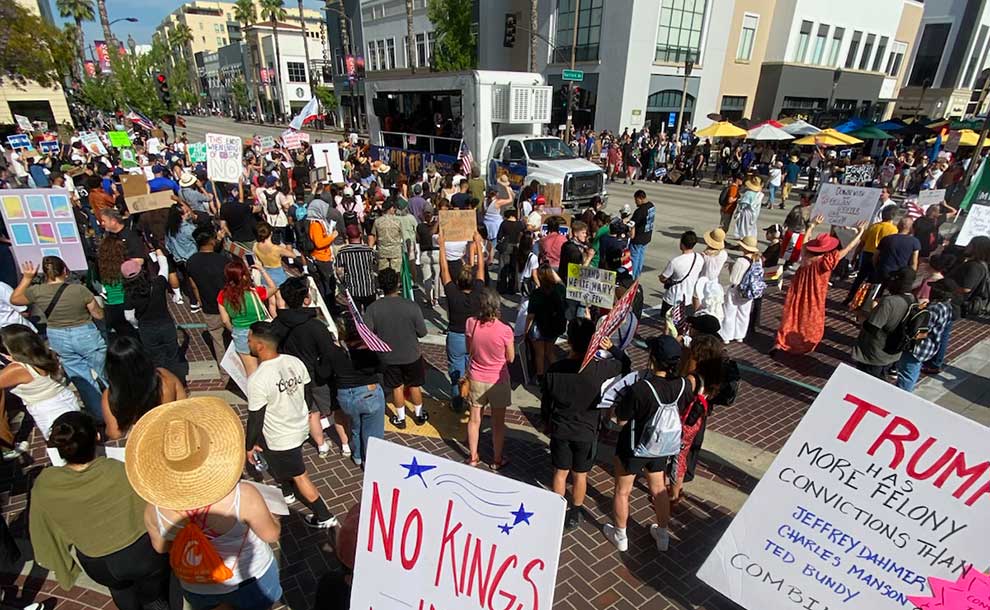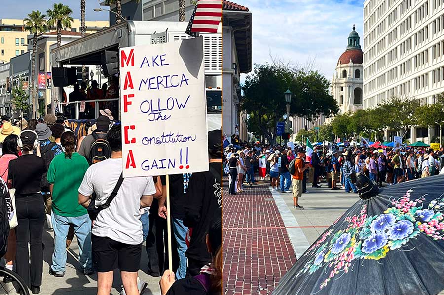 An estimated 5,000 people gathered in Pasadena on Saturday, June 14, as part of the national No Kings Day mobilization. The protest began at the intersection of Lake Avenue and Colorado Boulevard and expanded into nearby streets, including South Mentor Avenue, Green Street, and as far west as the Paseo on Colorado Blvd. Pasadena police closed portions of Colorado Blvd. to vehicle traffic to accommodate the crowd.