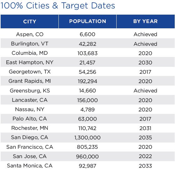 Pasadena 100 builds on the Sierra Club’s ReadyFor100 campaign, a campaign challenging 100 cities across the United States to commit to 100% clean energy by 2035. Some of the cities already committed to that goal are shown in the table below. More are committing all the time – a recent example is Salt Lake City, Utah.