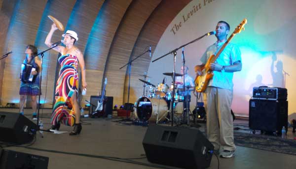 The local Levitt’s sound engineer was not familiar with all the songs, naturally. This situation produced few mishaps, as some solo singers were not heard. By the time the engineer got to boost their mic, another soloist had started singing. A big band such as Playing for Change needs a dedicated sound engineer traveling with them. That way he will be familiar with the songs and the solo assignments.