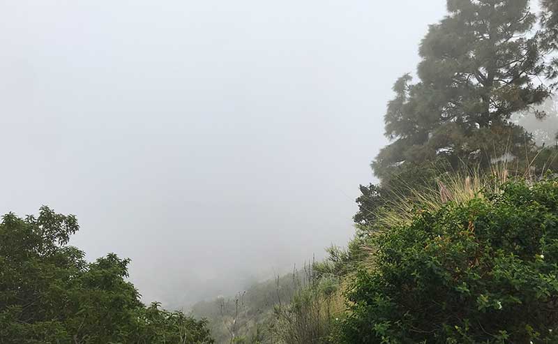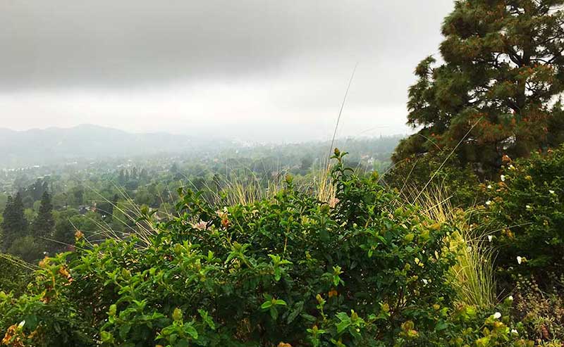 Verdugo Hills hospital in the center of the picture, peering through gloom, gray and murk. (Photo – Reg Green)