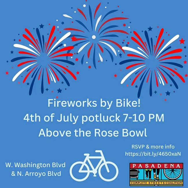 Fireworks by Bike July 4, 2024 7:00 pm- 10:00 pm Location W. Washington Blvd and N. Arroyo Blvd Pasadena, CA